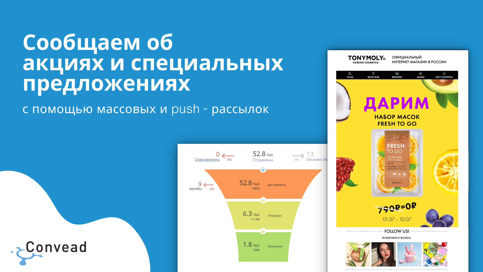 - Сообщаем об акциях и специальных предложениях с помощью массовых email и push-рассылок.