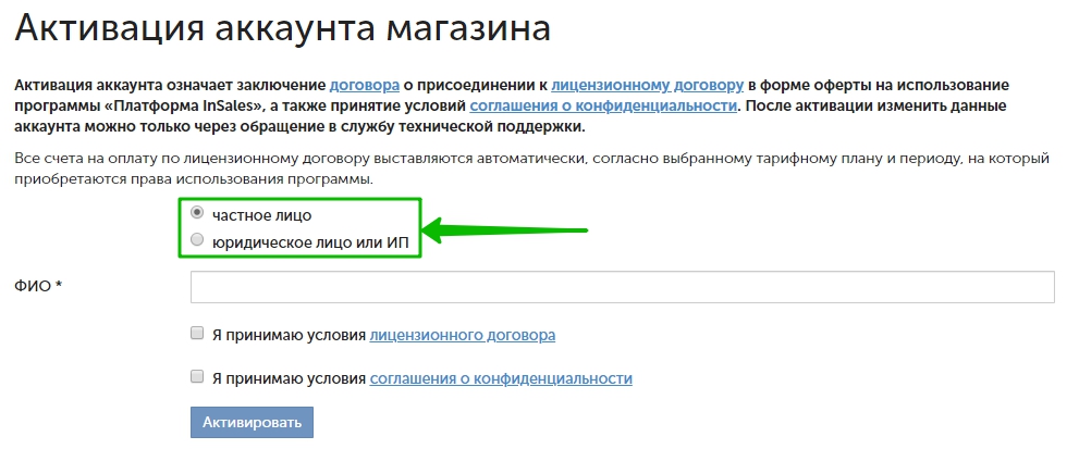 Чтобы подтвердить права на владение сайтом, нужно заключить договор с InSales. Договор можно оформить на физическое или юридическое лицо.