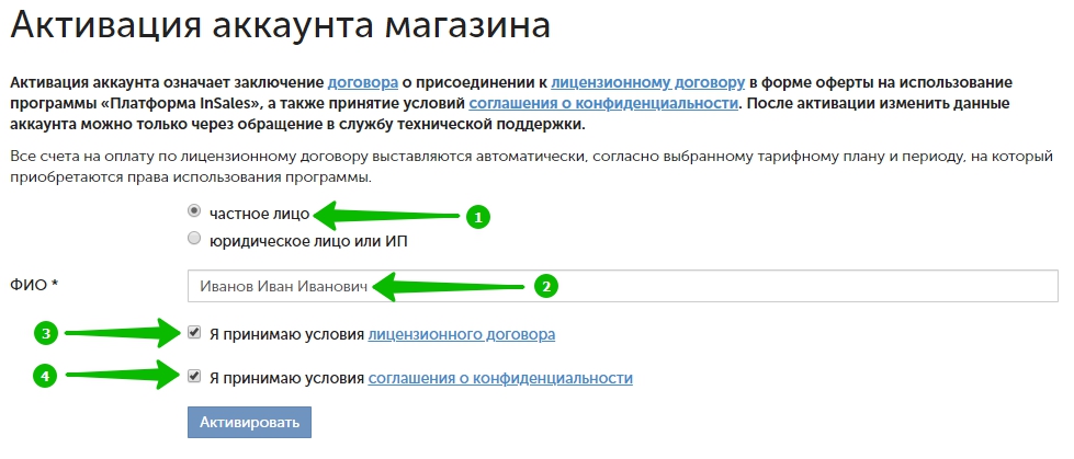 Для частного лица полностью укажите фамилию, имя и отчество владельца сайта. Примите условия лицензионного договора и соглашения о конфиденциальности. Нажмите кнопку «Активировать».