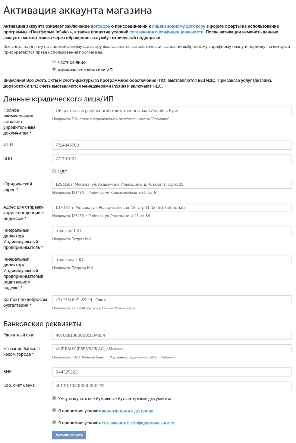 Для юридического лица или ИП введите данные организации или ИП. Если вы хотите получать бумажные версии закрывающих документов, то поставьте галочку «Хочу получать все бумажные бухгалтерские документы».