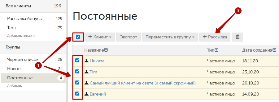1. В разделе бэк-офиса Клиенты выберите клиентов, которым нужно отправить рассылку, чтобы появилась кнопка +Рассылка