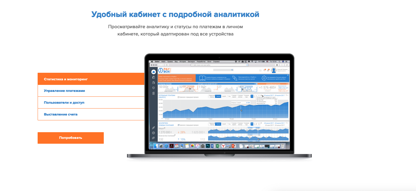 Также с помощью PayBox.money можно организовать выплаты на карты сотрудникам и клиентам, индивидуальное выставление счетов и платежи в рассрочку. За всеми транзакциями можно следить в удобном личном кабинете.